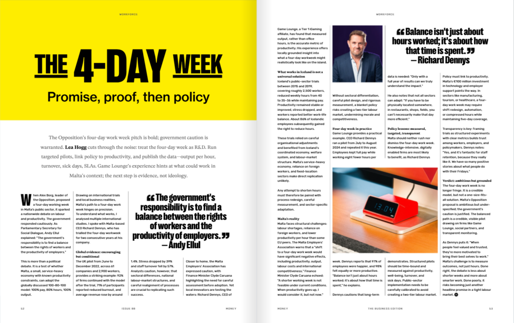 Game Lounge, based in Malta, ran a pilot of the four-day work week from July to August in 2024, and repeated the trial in 2025. While speaking with Money Magazine about how Game Lounge has trialled the four-day week, CEO Richard Dennys said that balance is not simply just about the number of hours worked, but is rather about how that time is spent.